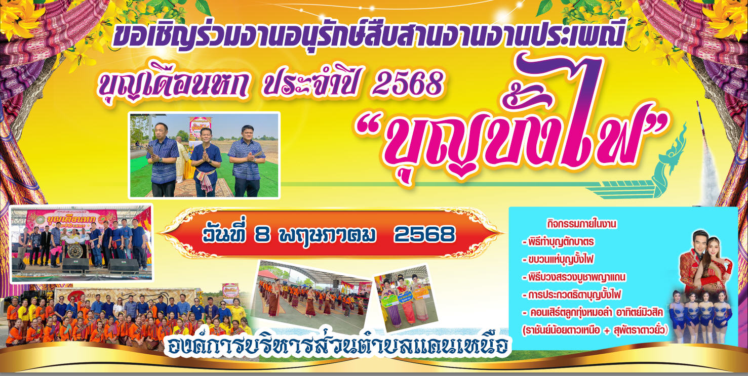 รายละเอียด : องค์การบริหารส่วนตำบลแคนเหนือ ขออนุญาตประชาสัมพันธ์ ด้วยองค์การบริหารส่วนตำบลแคนเหนือ จัดงานอนุรักษ์สืบสานงานประเพณีบุญเดือนหก ประจำปี 2568 ในวันที่ 8 พฤษภาคม พ.ศ.2568 ณ องค์การบริหารส่วนตำบลแคนเหนือ ร่วมชมขบวนแห่บุญบั้งไฟ ขบวนนางฟ้านางรำตำบลแคนเหนือ คอนเสิร์ตลูกทุ่งหมอลำ อาทิตย์มิวสิค และการประกวดธิดาบุญบั้งไฟ ตำบลแคนเหนือ ประจำปี 2568 สนใจสมัครได้ที่ กองการศึกษา ศาสนาและวัฒนธรรม องค์การบริหารส่วนตำบลแคนเหนือ โทร 043-306-130 ,084-5122603